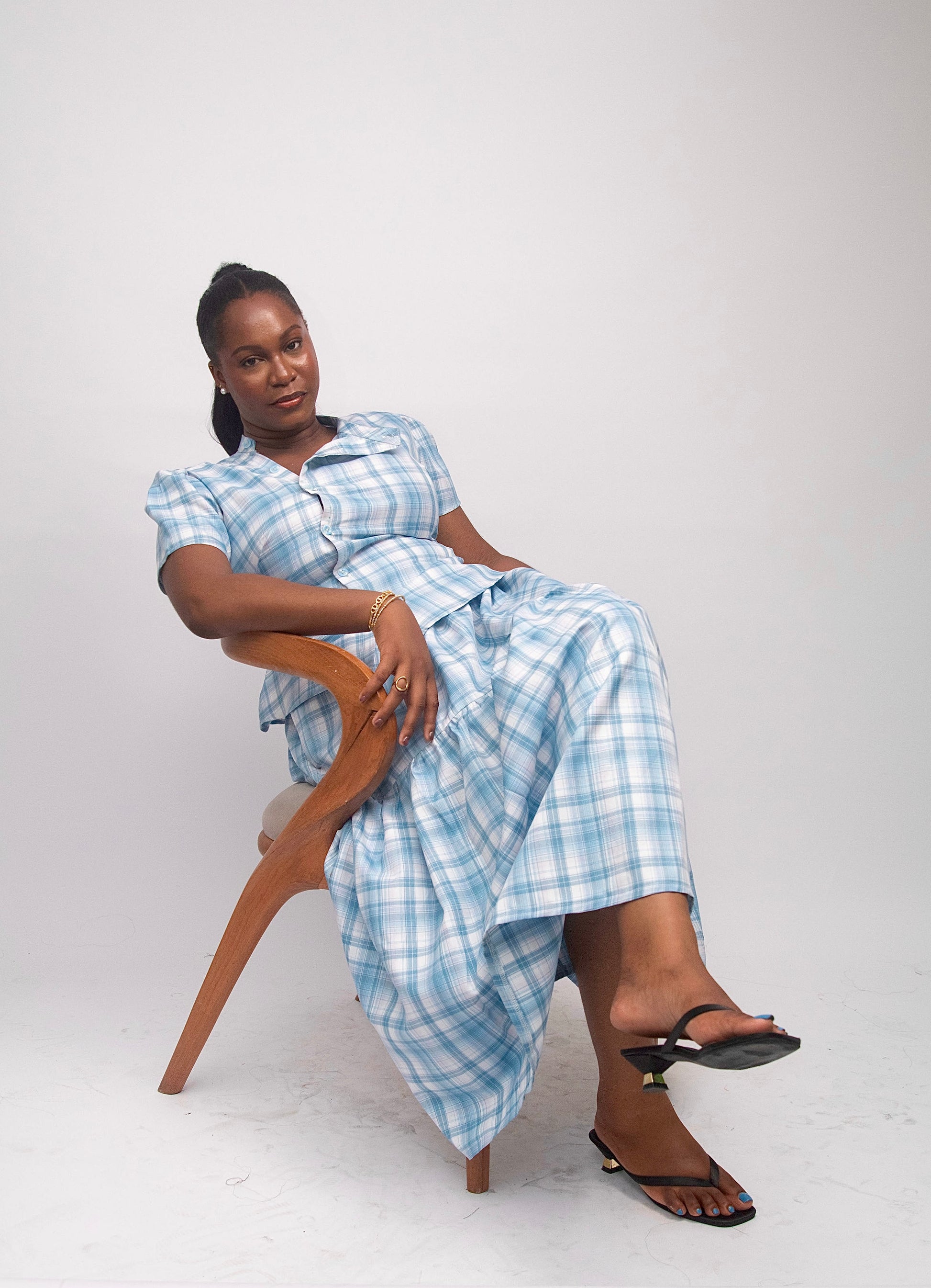 Crafted from breathable cotton in a light blue plaid pattern, this set brings a nostalgic, summery feel perfect for brunches, picnics, and easy weekend outings.