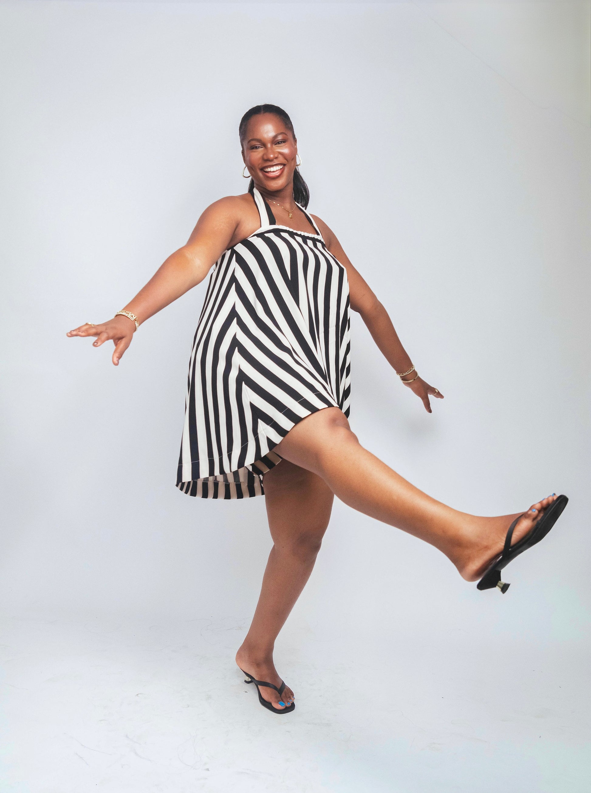 - Striking Vertical Stripe: Classic black and white stripes that elongate and flatter every silhouette.